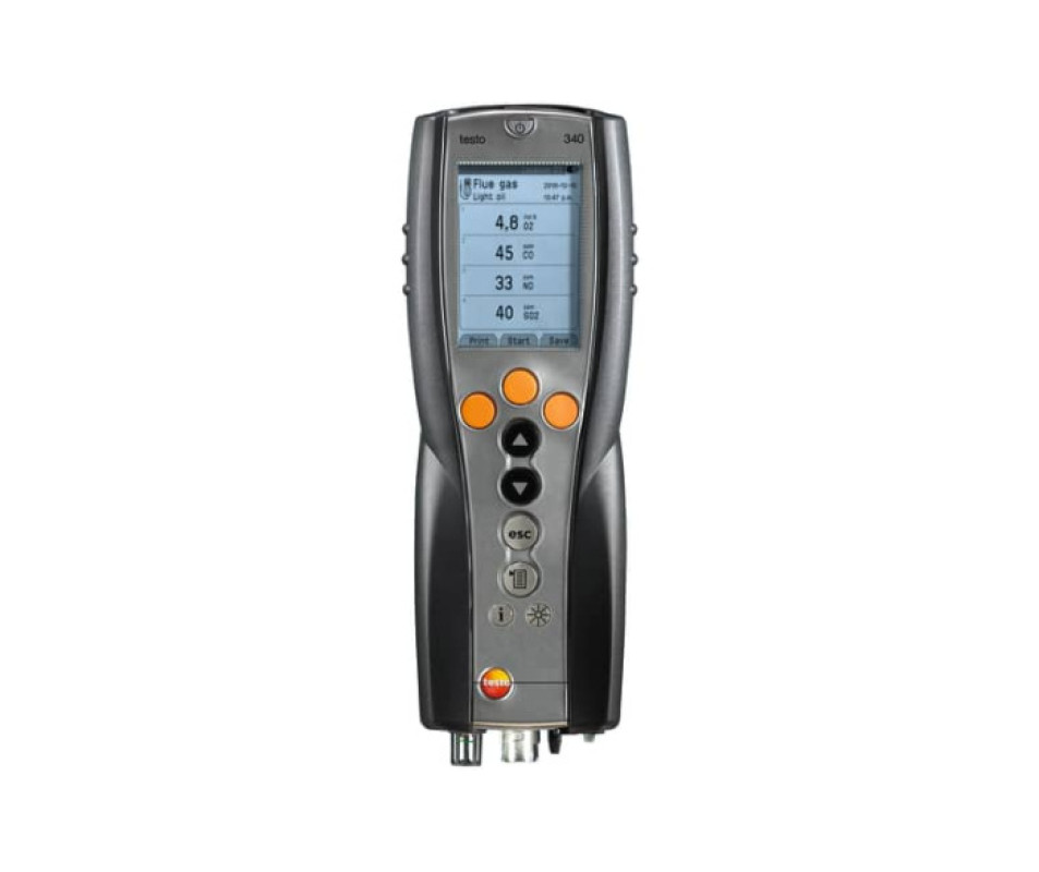 Анализатор дымовых газов testo 340, вкл. заводской протокол калибровки, ремень для переноски, сенсор O2 и встроенную функцию параллельного измерения скорости потока газа/ дифференциального давления.Примечание: для использования testo 340 Вам потребуется второй сенсор газа. Вы можете дооснастить прибор 3 дополнительными сенсорами.