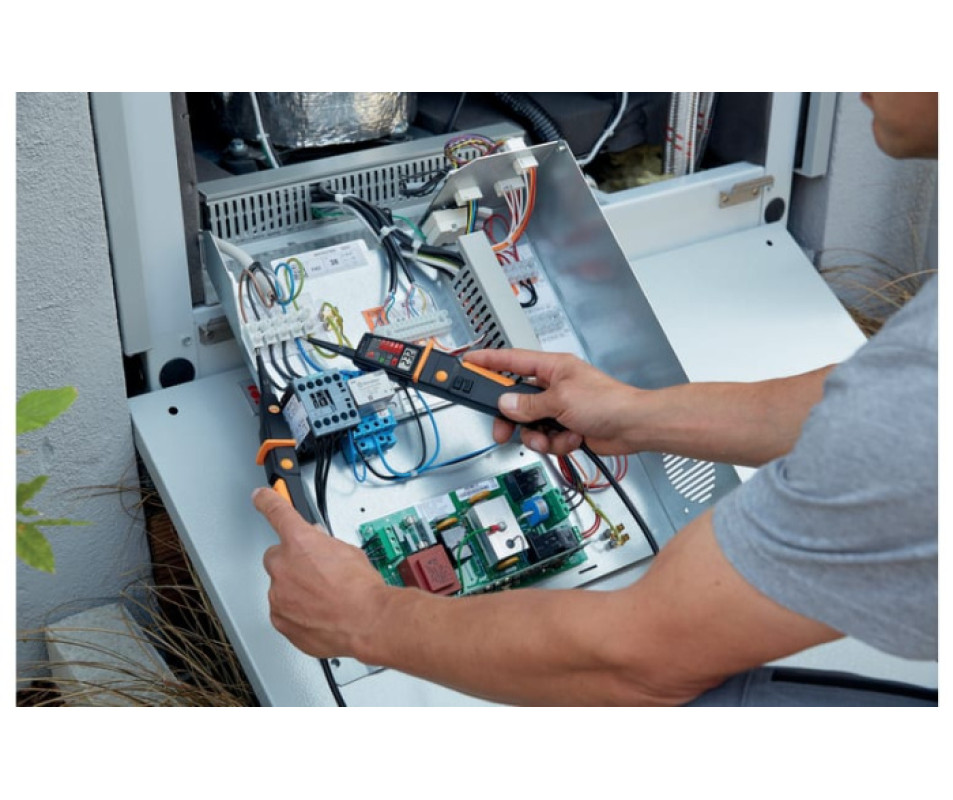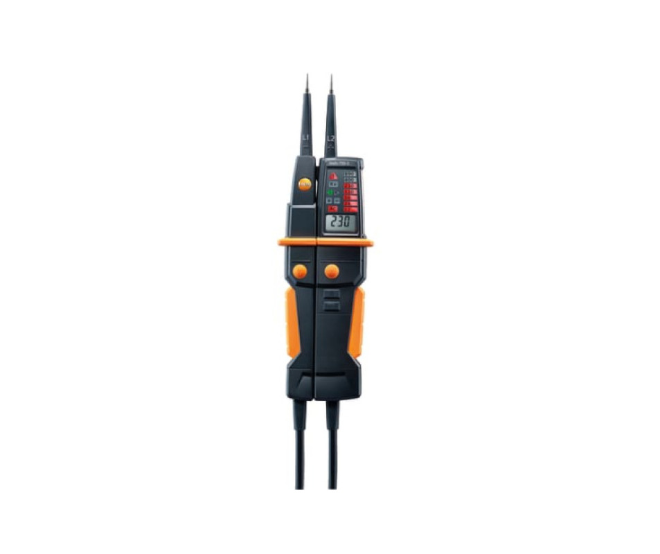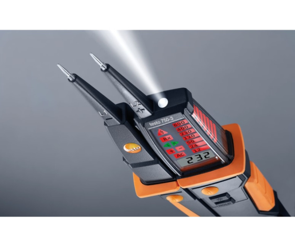 Тестер напряжения testo 750-3 прежде всего подходит для проверки наличия или отсутствия напряжения в электрической сети. Помимо этого, он также может использоваться для теста целостности цепи, определения направления вращающихся магнитных полей и тестирования устройств защитного отключения. Благодаря вибрации при нажатии на кнопки запуска тест отключения не может быть проведен случайно.
